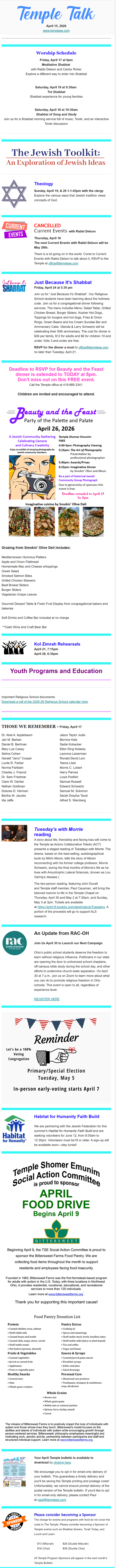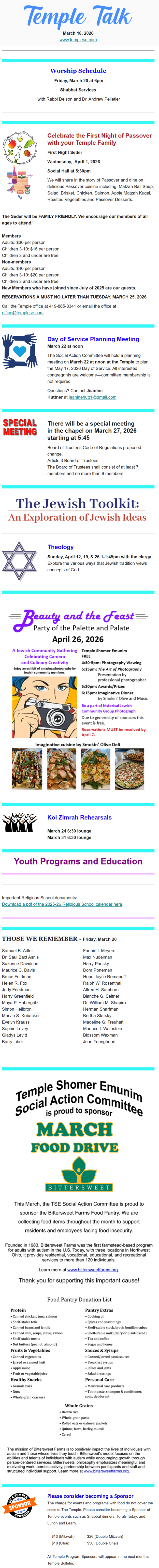 Following Friday night services will include a fresh fruit tray, vegetable tray w/hummus, cubed cheese tray with hot vidalia onion dip, assorted sweets, iced tea, coffee and tea